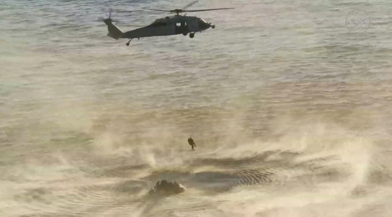 A la 1:07 GMT, equipos de recuperación del buque de la Marina USS John P. Murtha se acercan a la cápsula. Los buzos conectan una plataforma inflable y extraen a los astronautas uno por uno. Luego son trasladados en helicóptero al barco.