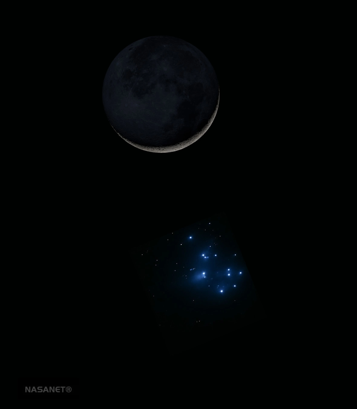 La Luna y el Cúmulo de las Pléyades nos regalan uno de los encuentros más bonitos de Abril. Credit: NASANET