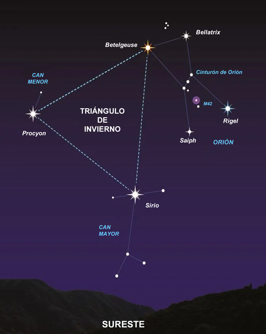 También podrás observar el Triángulo de Invierno, formado por Sirio, Procyon y la brillante Betelgeuse.