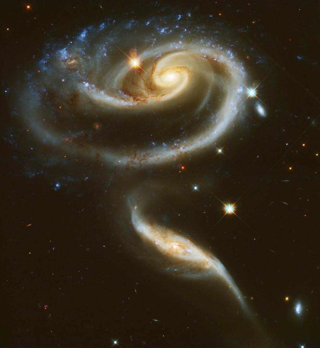 Se trata de Arp 273, un par de galaxias ubicadas en la constelación de Andrómeda. La galaxia espiral más grande, UGC 1810, ha sido distorsionada por la atracción gravitacional de su compañera más pequeña, UGC 1813, creando una forma que se asemeja a una rosa cósmica.