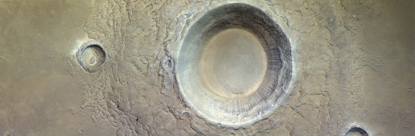 Este remanente de un antiguo impacto es sólo una de las muchas cicatrices que los asteroides han infligido al Planeta Rojo. El agua, los volcanes y los impactos de asteroides dieron forma a la superficie marciana en el pasado antiguo. Marte es actualmente un desierto frío y seco.