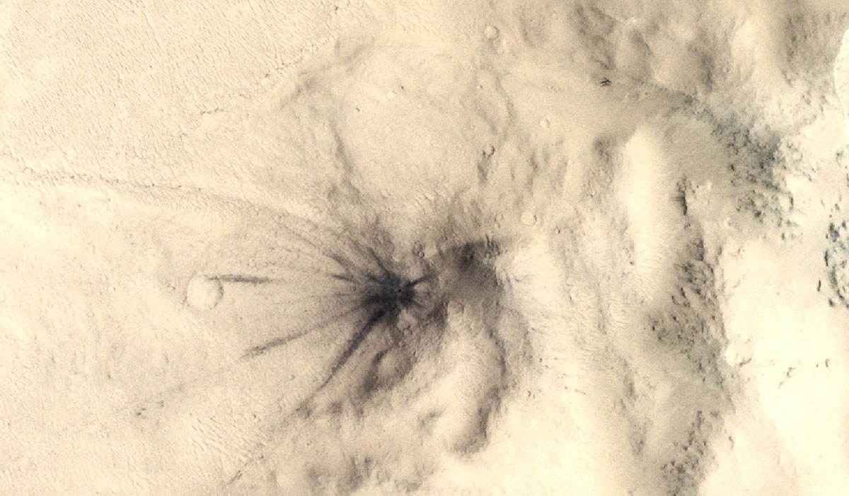 Una roca procedente del espacio se estrelló contra Marte en febrero de 2021, provocando ondas sísmicas que alcanzaron la sonda espacial InSight de la NASA, situada a 1.640 km de distancia. El impacto dejó un cráter de 21 m de diámetro y abolló un área de unos 1.400 m. La explosión fue captada en esta imagen por la sonda TGO de ExoMars de la ESA utilizando su Sistema de Imágenes de Superficie en Color y Estéreo (CaSSIS).