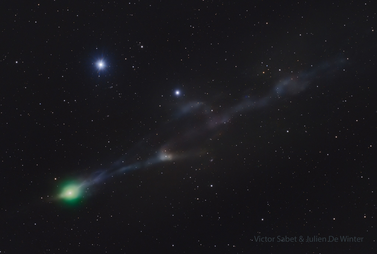 Esta imagen del cometa 3I/ATLAS captada por un telescopio terrestre revela una coma verde, una cola iónica azulada que serpentea mientras es desviada por el viento solar, y una ligera anti-cola, todos rasgos típicos de los cometas. Credit: Victor Sabet & Julien De Winter