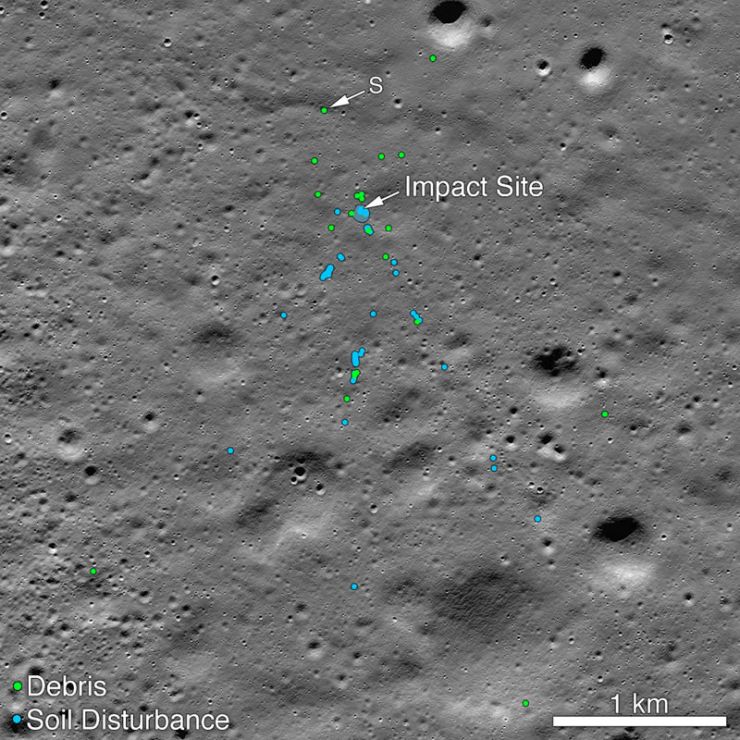 Los escombros localizados por primera vez por Shanmuga están a unos 750 metros al noroeste del sitio principal del accidente y fueron una única identificación de píxeles brillantes en ese primer mosaico (1,3 metros de píxeles, ángulo de incidencia de 84 °). El mosaico de noviembre muestra mejor el cráter de impacto, el rayo y el extenso campo de escombros. Las tres piezas más grandes de escombros son cada una de aproximadamente 2x2 píxeles y proyectan una sombra de un píxel.