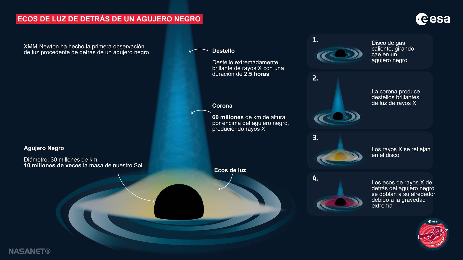 Utilizando los telescopios espaciales XMM-Newton de la ESA y NuSTAR de la NASA, un equipo internacional de científicos dirigido por Dan Wilkins de la Universidad de Stanford en los EE.UU. observó destellos extremadamente brillantes de luz de rayos X provenientes de alrededor de un agujero negro.