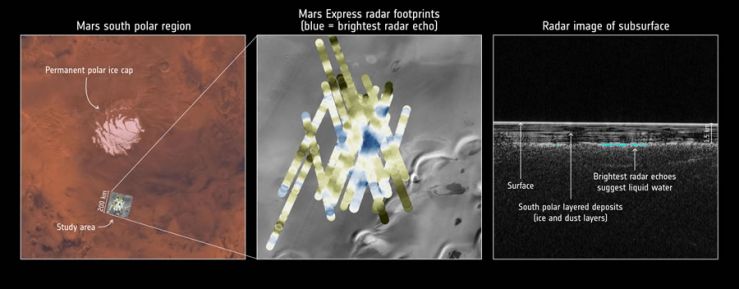 Los datos del radar recopilados por la sonda espacial Mars Express de la ESA apuntan a un lago de agua líquida enterrado bajo capas de hielo y polvo en la región polar sur de Marte.