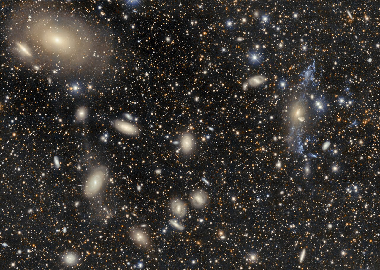A unos 200 millones de años luz de distancia, Abell 3574 es un grupo gravitatorio que reúne cientos de galaxias. Los cúmulos de galaxias son las segundas estructuras más grandes conocidas en el Universo, y aún a esa magnitud, sus galaxias nunca están demasiado alejadas entre sí. En la parte superior izquierda destaca la gran galaxia IC 4329, rodeada de anillos luminosos que revelan indicios de una colisión cósmica pasada. A la derecha, los fragmentos luminosos dispersos de gas azul y blanco son el rastro que evidencia un choque similar con la galaxia NGC 5291 (de color amarillo). Si observas con atención, podrás encontrar más pruebas de galaxias que interactúan bajo la fuerza de la gravedad. ¿Logras ver alguna?
