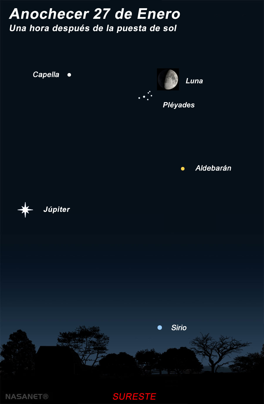 Aproximadamente una hora después del atardecer, mira hacia el sureste: verás la Luna creciente gibosa (70 % iluminada) y, justo a su derecha, las Pléyades. Hoy estuvieron aún más cerca, pero igual se verán muy juntas cuando oscurezca. La luz de la Luna hará que algunas estrellas del cúmulo se vean menos, ¡pero seguro podrás distinguir varias!