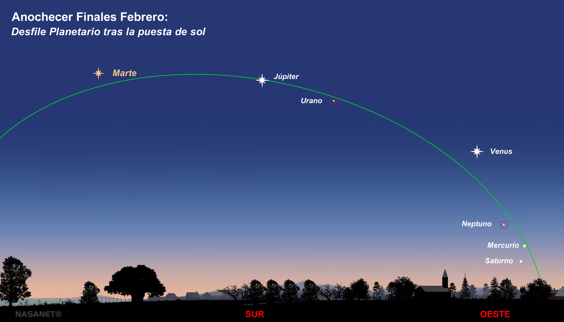 Hoy viernes 28 de Febrero, según los astrónomos, será el mejor día para observar, poco después de la puesta de sol y una vez comience a anochecer, los planetas Saturno, Mercurio, Neptuno, Venus, Urano, Júpiter y Marte.