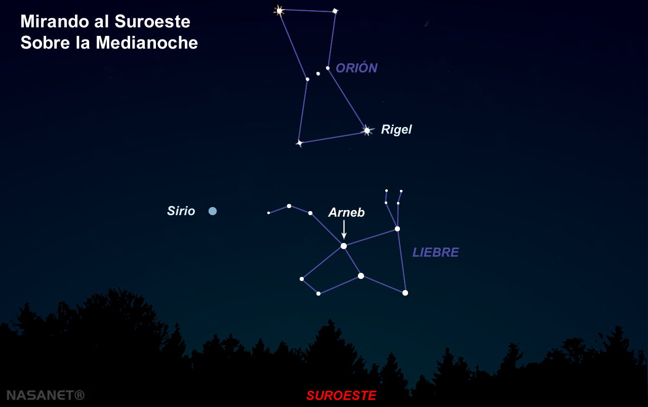 Al hacerse visible sobre la noche a medida que Orión se eleva más alto en el cielo, mira inmediatamente debajo de la estrella más brillante de Orión, la blanquiazul Rigel, y mantente a la derecha del deslumbrante Sirio. Encontrarás alrededor de 11 estrellas visibles que hacen la forma de un conejo (o liebre):