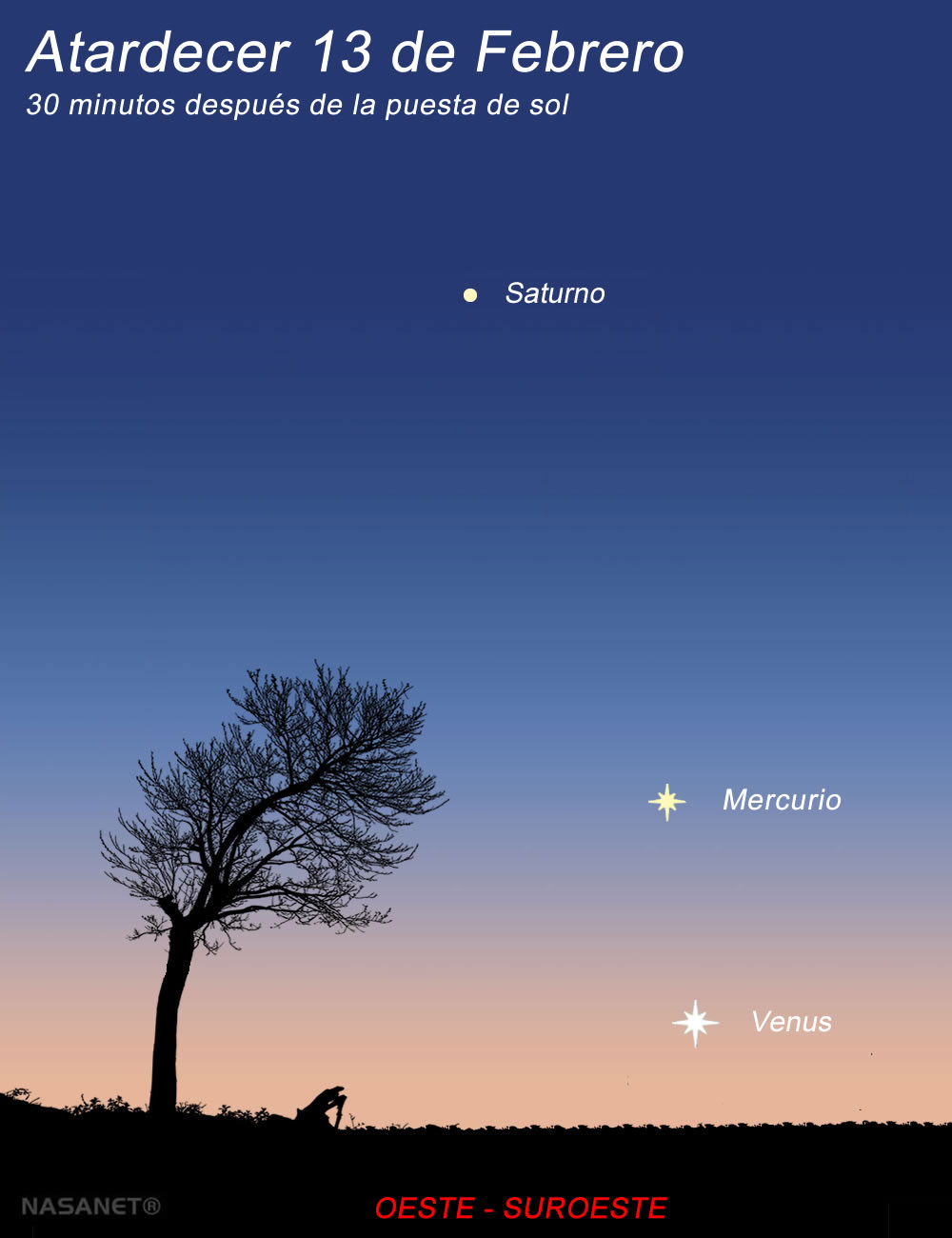Si miras hoy unos 30 minutos después de la puesta de Sol hacia el horizonte oeste, podrás ver a Mercurio, Venus (muy bajo) y a Saturno. Pero tendrás que tener un horizonte muy despejado, ya que Venus apenas está comenzando a hacer su aparición en los cielos del atardecer, y se encontrará muy próximo al horizonte, por lo que la hermosa vista de los tres planetas durará poco tiempo, así que conviene intentar localizar a Venus lo antes posible tras la puesta del Sol; unos binoculares o prismáticos pueden ser de gran ayuda.