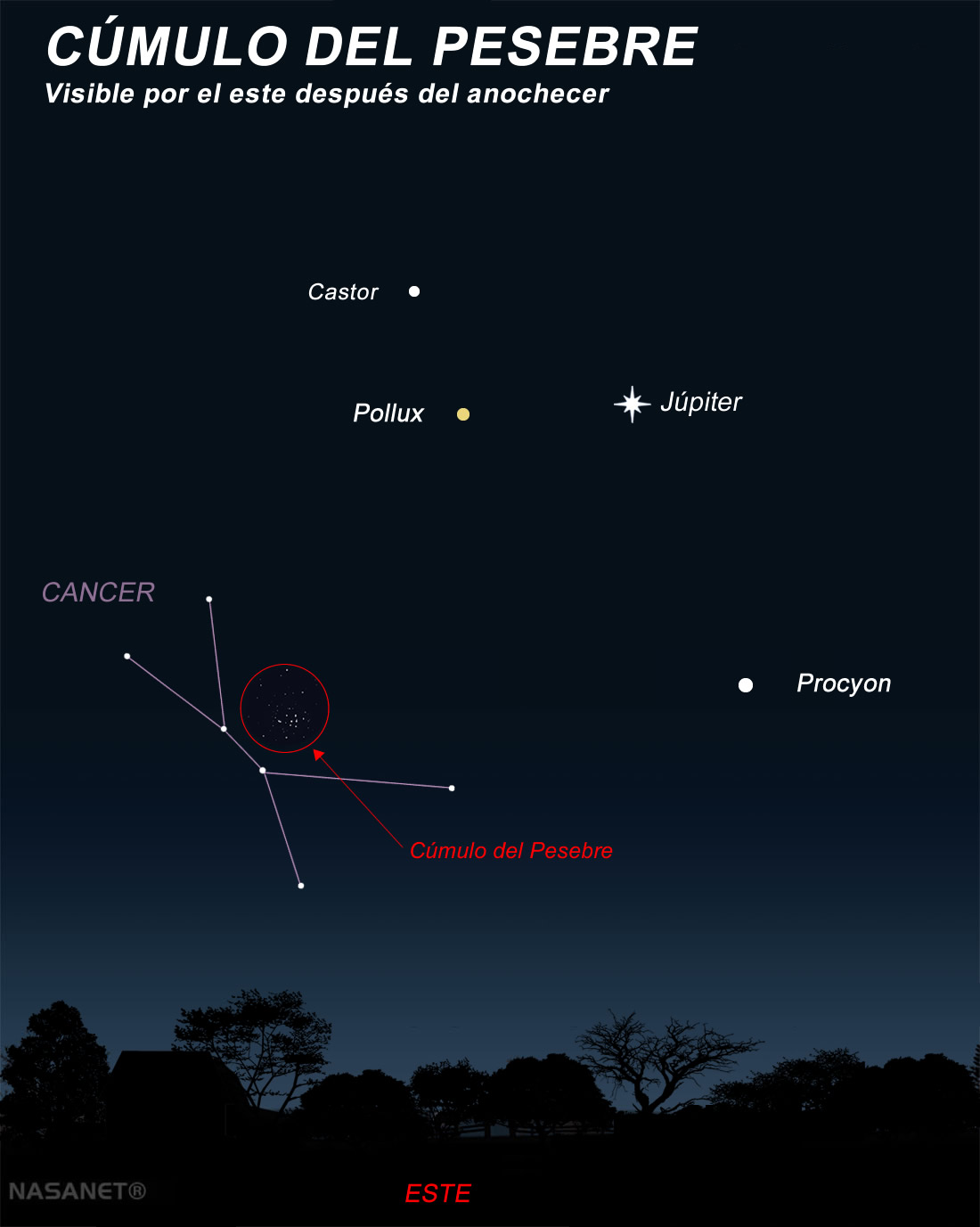 Para ver el cúmulo del Pesebre desde el hemisferio norte, mira el cielo nocturno del este después del atardecer y antes de la medianoche durante todo el mes. Las mejores noches para observar este cúmulo son a mediados de enero, cuando el cúmulo no está demasiado alto o bajo en el cielo para poder verlo. En el hemisferio sur, el cúmulo del Pesebre aparece bajo en el cielo. Búscalo poco después del atardecer sobre el horizonte hacia el noreste.