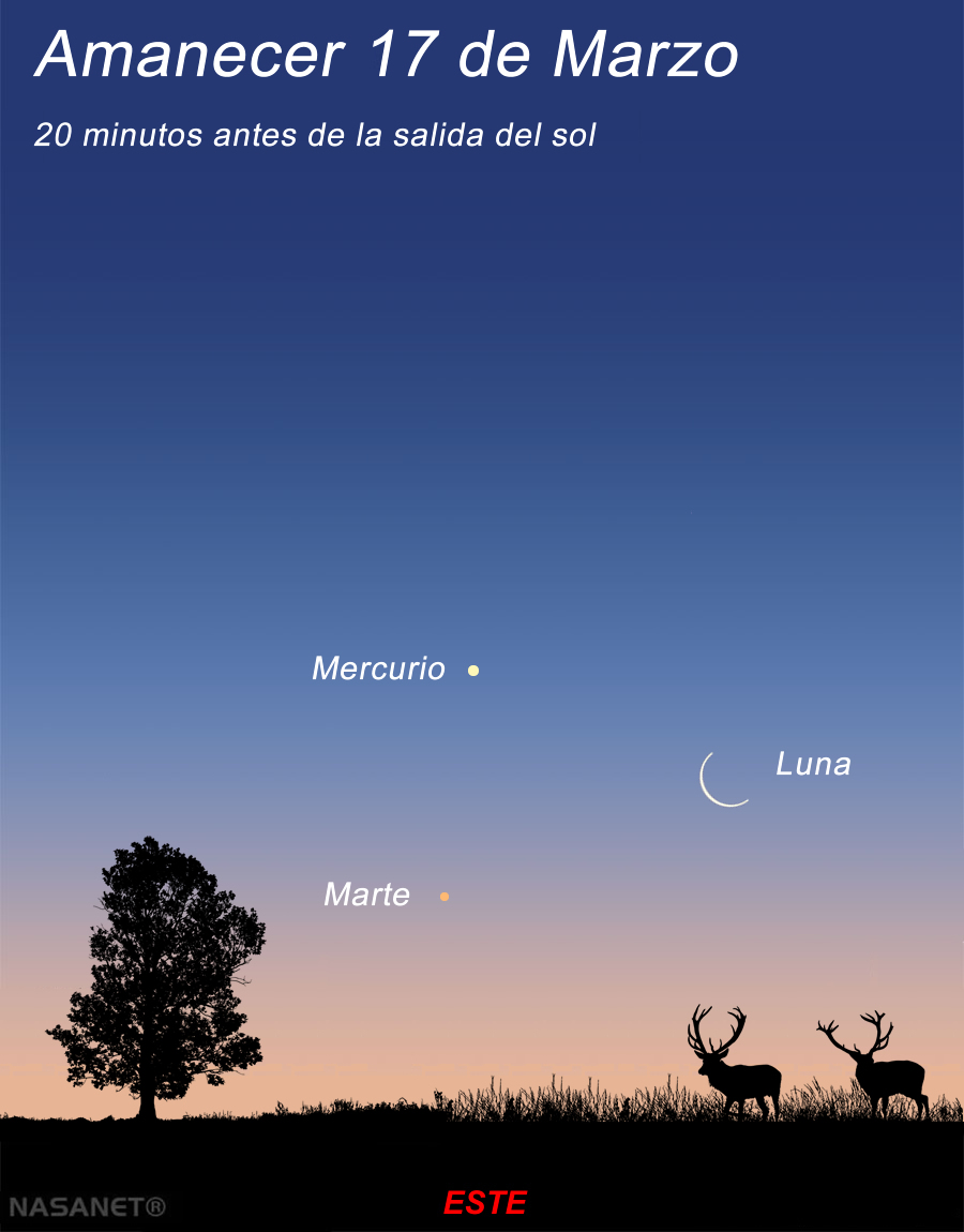 La madrugada del 17 de Marzo el cielo nos regalará un espectáculo astronómico muy delicado: una finísima Luna menguante aparecerá en conjunción con Mercurio y Marte justo antes de salir el Sol.
