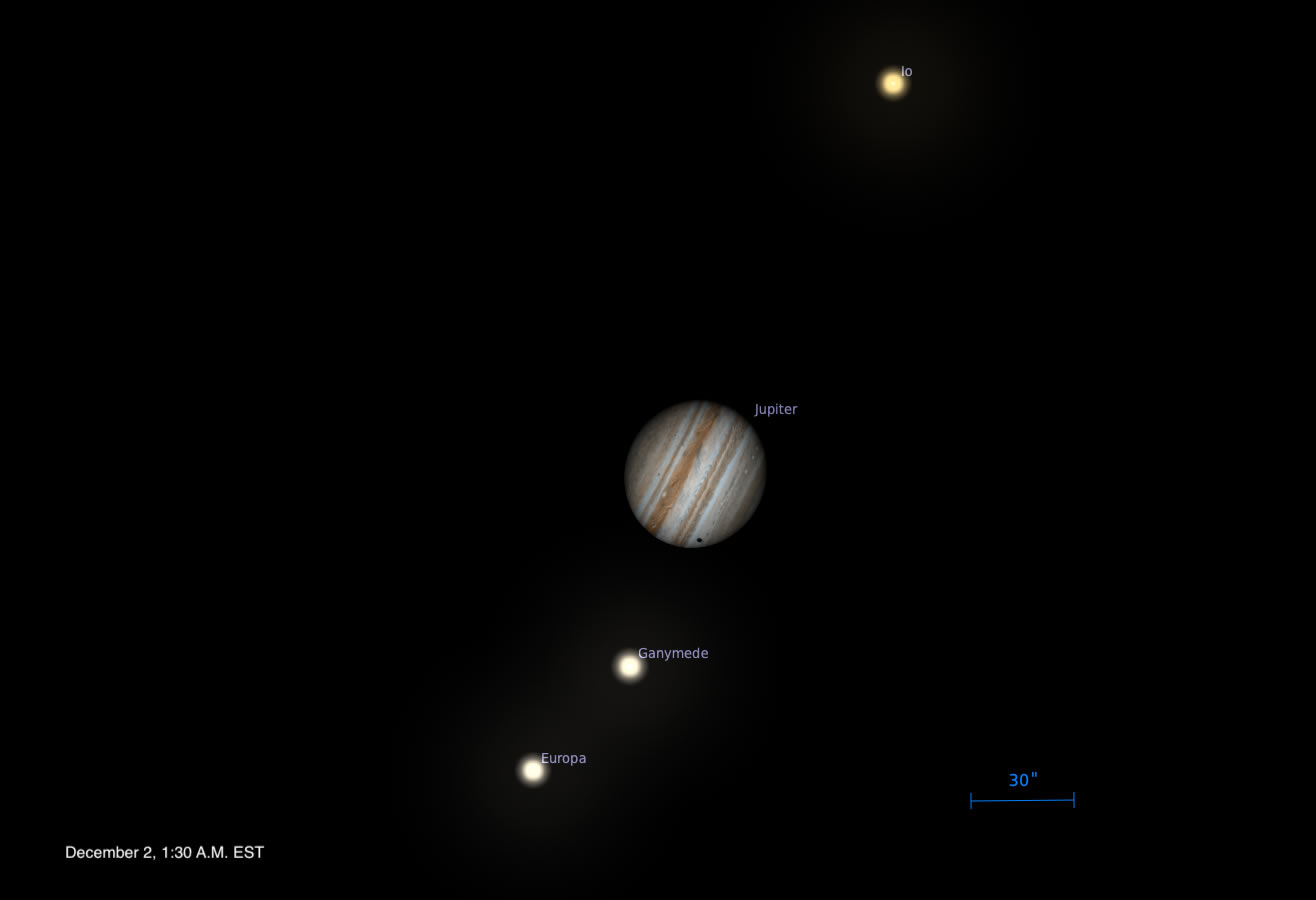 Esta noche del 1 al 2 de Diciembre podrás disfrutar de un fenómeno astronómico muy llamativo: la luna Ganimedes pasará por delante de Júpiter, proyectando su sombra sobre el planeta. Ganimedes es la luna más grande del Sistema Solar, así que su tránsito es especialmente notable.