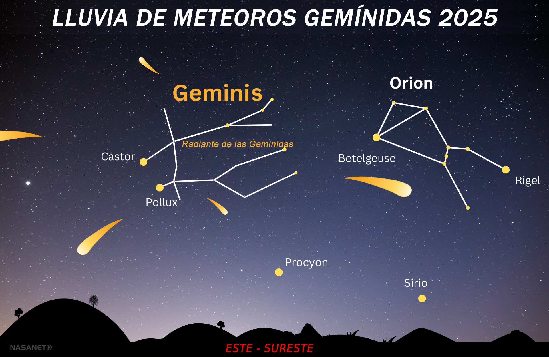 Según Bill Cooke, de la Oficina de Medio Ambiente de Meteoros de la NASA, el máximo de actividad llega entre la noche del 13 de diciembre y la madrugada del 14, cuando podrá verse hasta un meteoro por minuto en condiciones ideales. Entre la medianoche y las 4:00 a.m., con el radiante —ubicado en la constelación de Géminis— en lo alto del cielo, se espera la mayor cantidad de destellos.