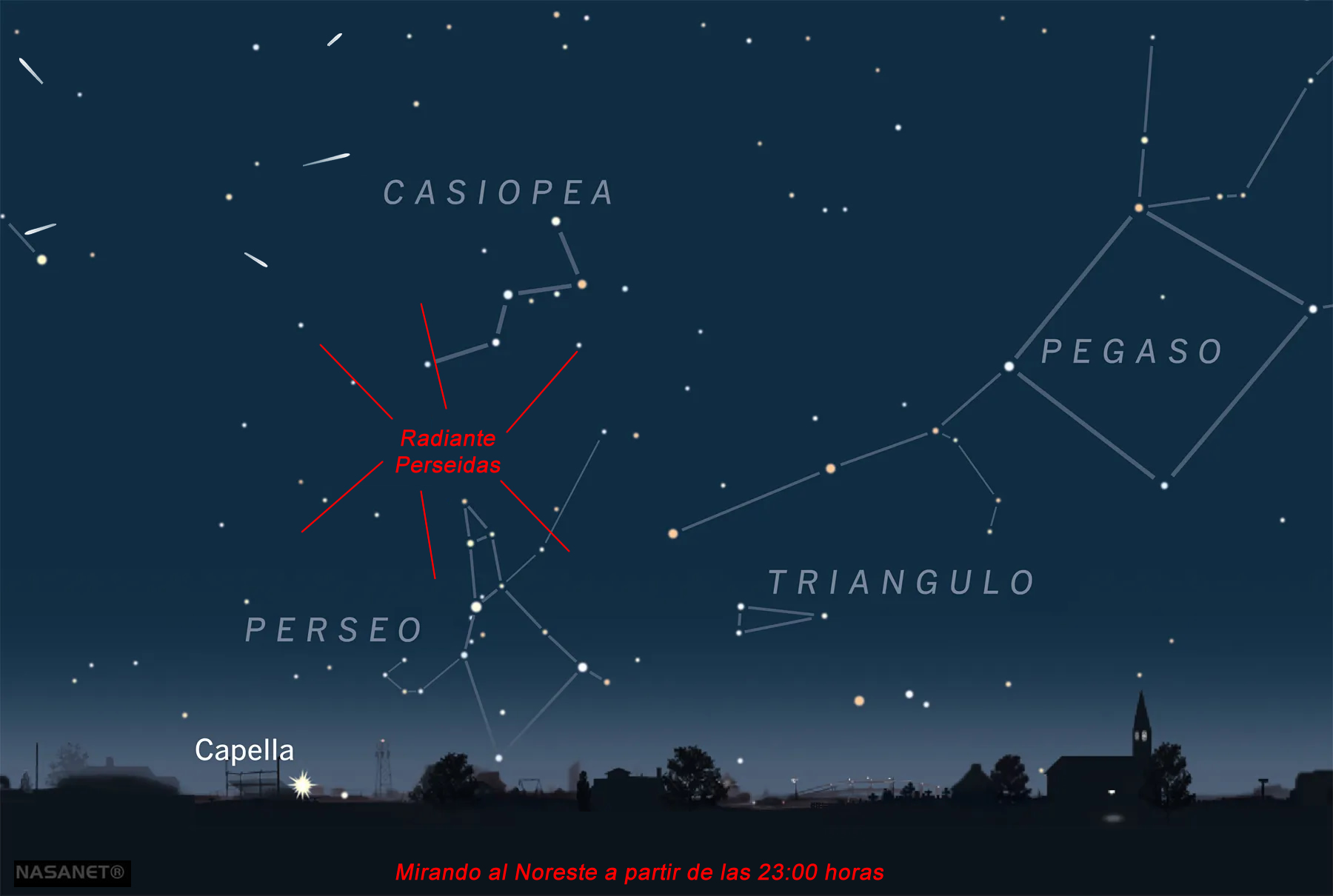 Una vez que el Sol se ponga, comenzará el espectáculo justo cuando la constelación de Perseo salga por el noreste. Éste es el momento para buscar a los meteoros Perseidas que se acercan desde el horizonte y rozan la atmósfera como rajuelas que saltan sobre la superficie de un lago.