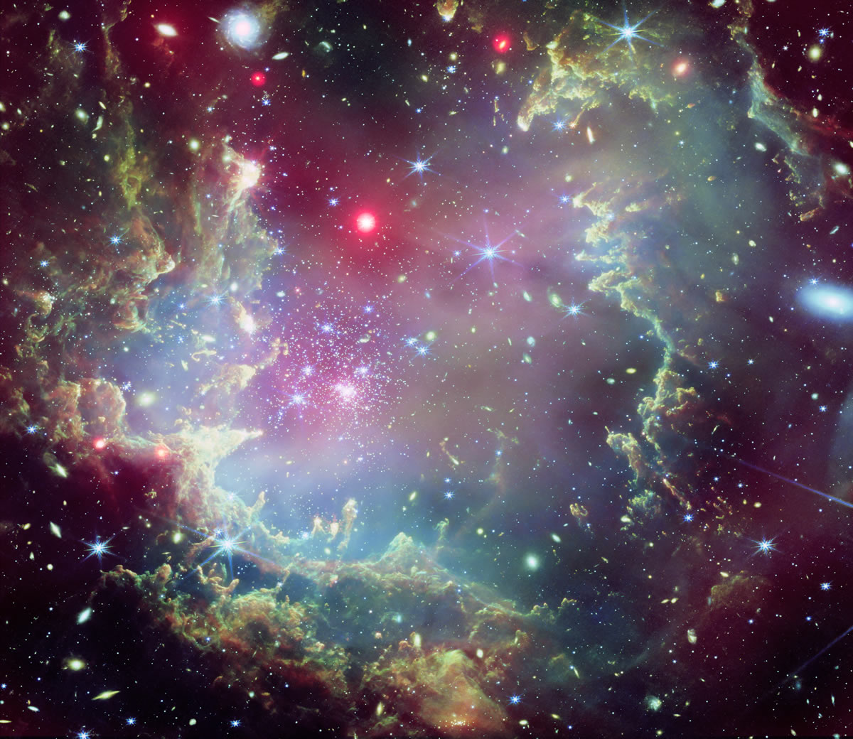Mientras tanto, los rayos X del Chandra (rojo) muestran estrellas jóvenes y masivas que iluminan la corona, enviando luz de alta energía al espacio interestelar. Estos rayos X son alimentados por vientos que fluyen desde las estrellas jóvenes y masivas que están esparcidas por todo el cúmulo. La nube extendida en los datos del Chandra probablemente proviene del resplandor de rayos X superpuesto de miles de estrellas jóvenes y de baja masa en el cúmulo.