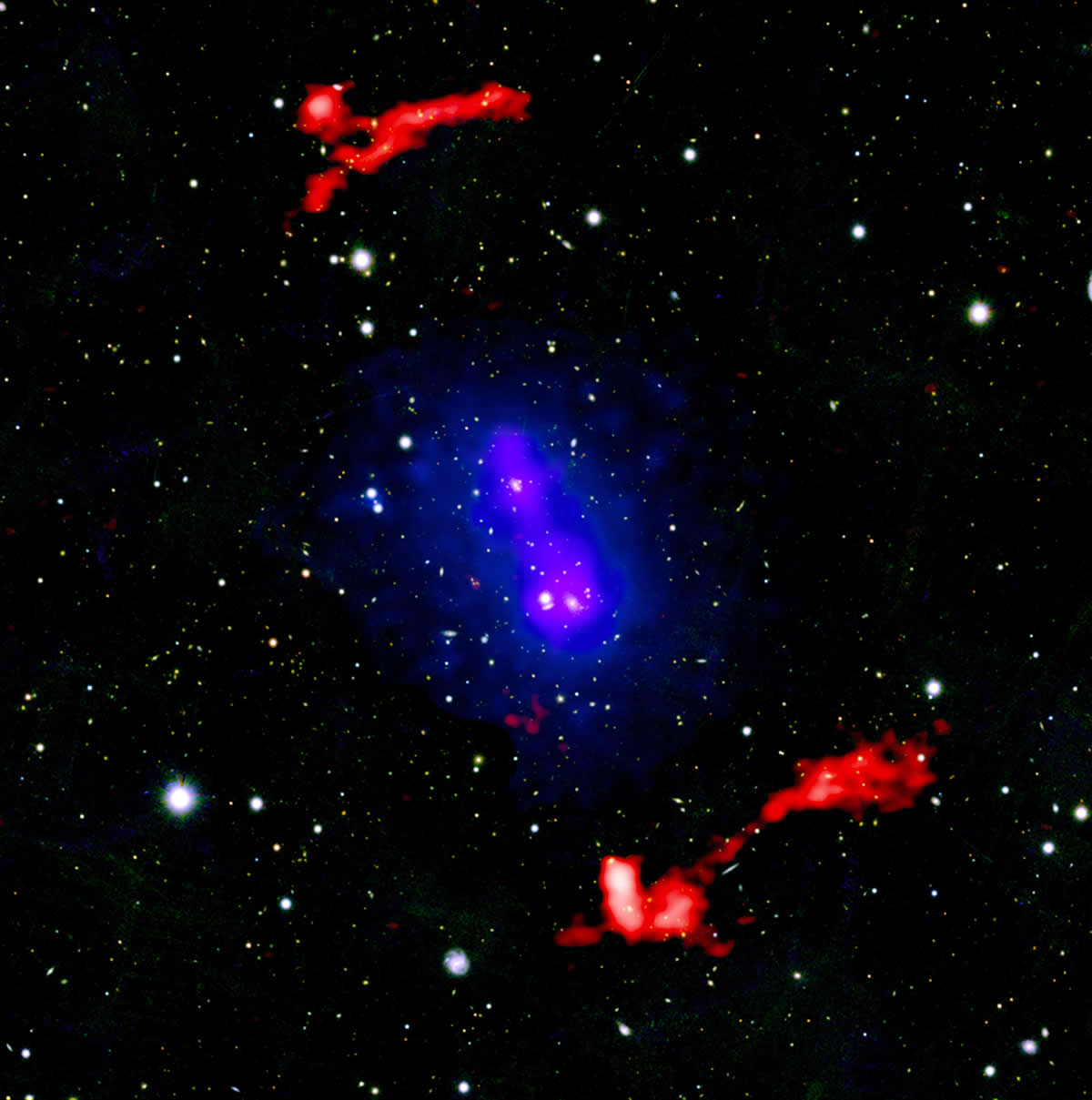 El cúmulo PSZ2 G181.06+48.47 (abreviado PSZ2 G181), ubicado a unos 2.800 millones de años luz, fue observado previamente en radio por la red LOFAR en los Países Bajos, que detectó estructuras con forma de paréntesis en su periferia. En esta nueva imagen compuesta, los datos en rayos X de Chandra (morado) y del XMM-Newton de la ESA (azul) se combinan con las observaciones en radio de LOFAR (rojo) y con una imagen óptica de las estrellas captada por los satélites Pan-STARRS.