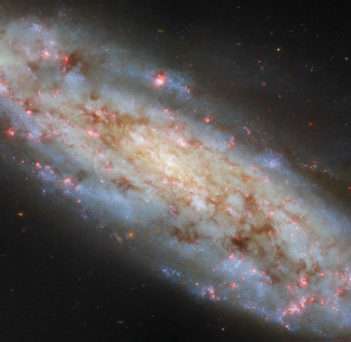 Desde su posición privilegiada en órbita terrestre, el Hubble nos muestra esta galaxia con una inclinación de unos 70 grados. Esto nos ofrece una vista intermedia: no completamente frontal (donde veríamos toda la forma espiral y sus brazos con claridad), ni completamente de canto (donde solo observaríamos un delgado perfil). Esta inclinación permite a los astrónomos estudiar tanto la estructura como la profundidad de su disco galáctico.
