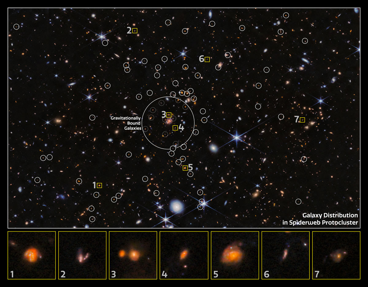 Usando el Telescopio Espacial James Webb de la NASA/ESA/CSA, un equipo internacional de astrónomos ha descubierto nuevas galaxias en el protocúmulo de la Telaraña. Sus características revelan que se están formando nuevas galaxias en estas grandes ciudades cósmicas, y ha descubierto que las interacciones gravitacionales en estas densas regiones no son tan importantes como se creía anteriormente.